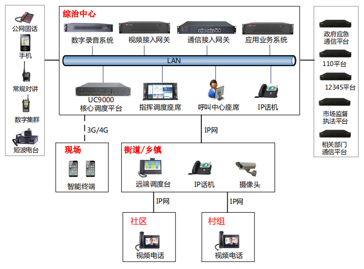 綜治指揮通信調(diào)度系統(tǒng)融合集群對講系統(tǒng)、天翼對講系統(tǒng)、電話、手機、語音會議系統(tǒng)、廣播系統(tǒng)、單兵系統(tǒng)、視頻監(jiān)控系統(tǒng)、視頻會議系統(tǒng)、預案系統(tǒng)、GIS 系統(tǒng)等,并配置短信、傳真等輔助手段,通過音頻、視頻、數(shù)據(jù)等手段實現(xiàn)上下級聯(lián)絡(luò)、信息報送和指揮,有效提高各級綜治中心快速反應(yīng)能力。