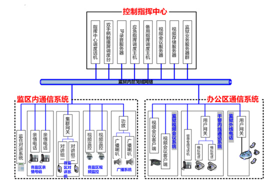 通過(guò)對(duì)監(jiān)獄部門(mén)工作的需求進(jìn)行分析,通過(guò)UC9000多業(yè)務(wù)調(diào)度通信系統(tǒng)來(lái)組建融合監(jiān)獄內(nèi)部各部門(mén)人員的內(nèi)部通信、外部通信、內(nèi)部視頻會(huì)議、監(jiān)區(qū)內(nèi)對(duì)講系統(tǒng)、監(jiān)倉(cāng)對(duì)講系統(tǒng)、廣播系統(tǒng)、親情電話等各種通信模式的監(jiān)獄多業(yè)務(wù)調(diào)度通信平臺(tái)。